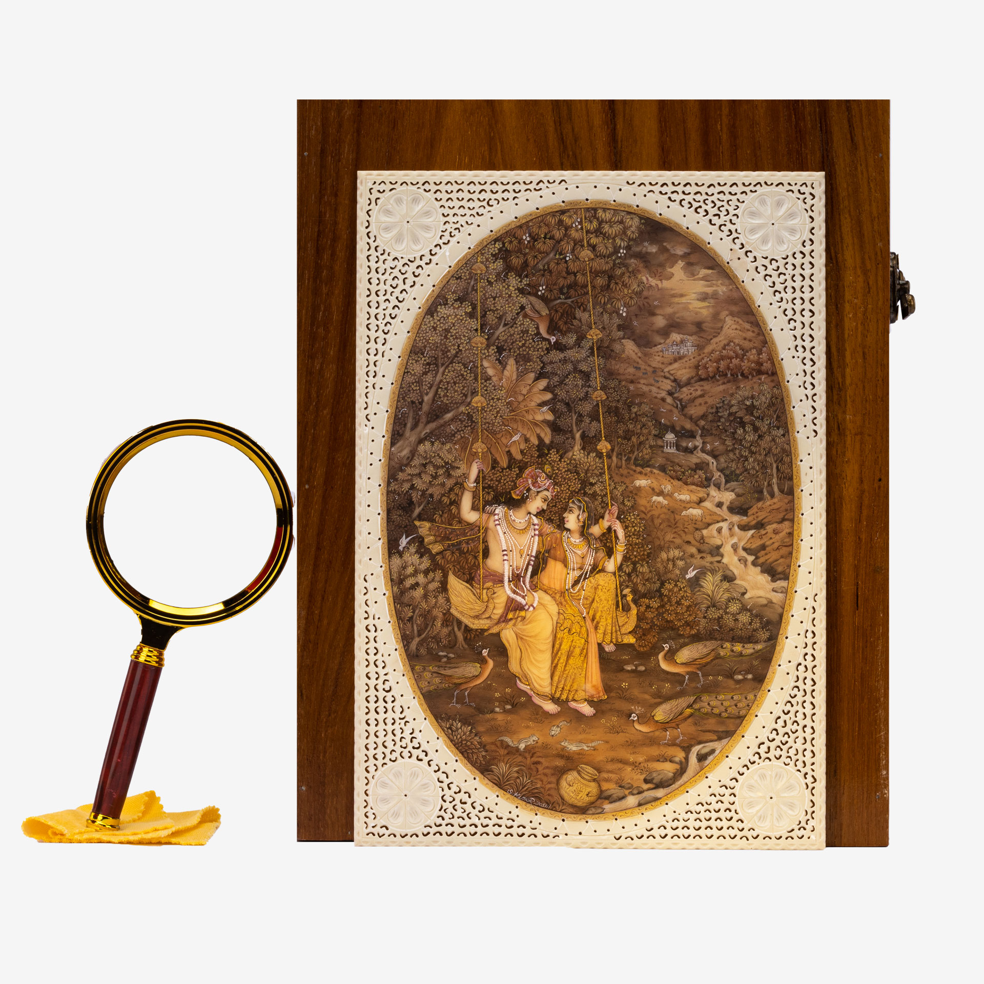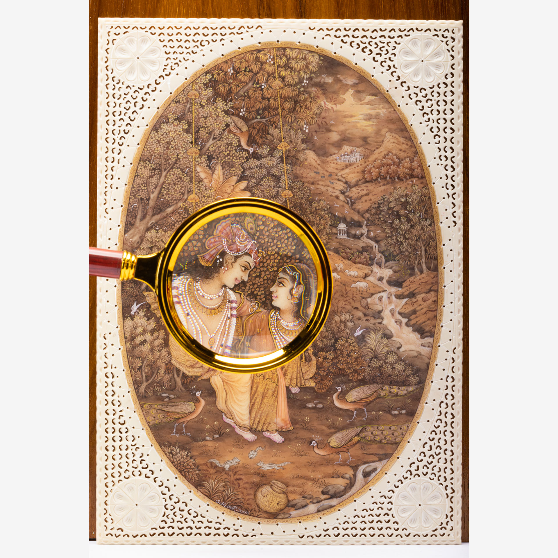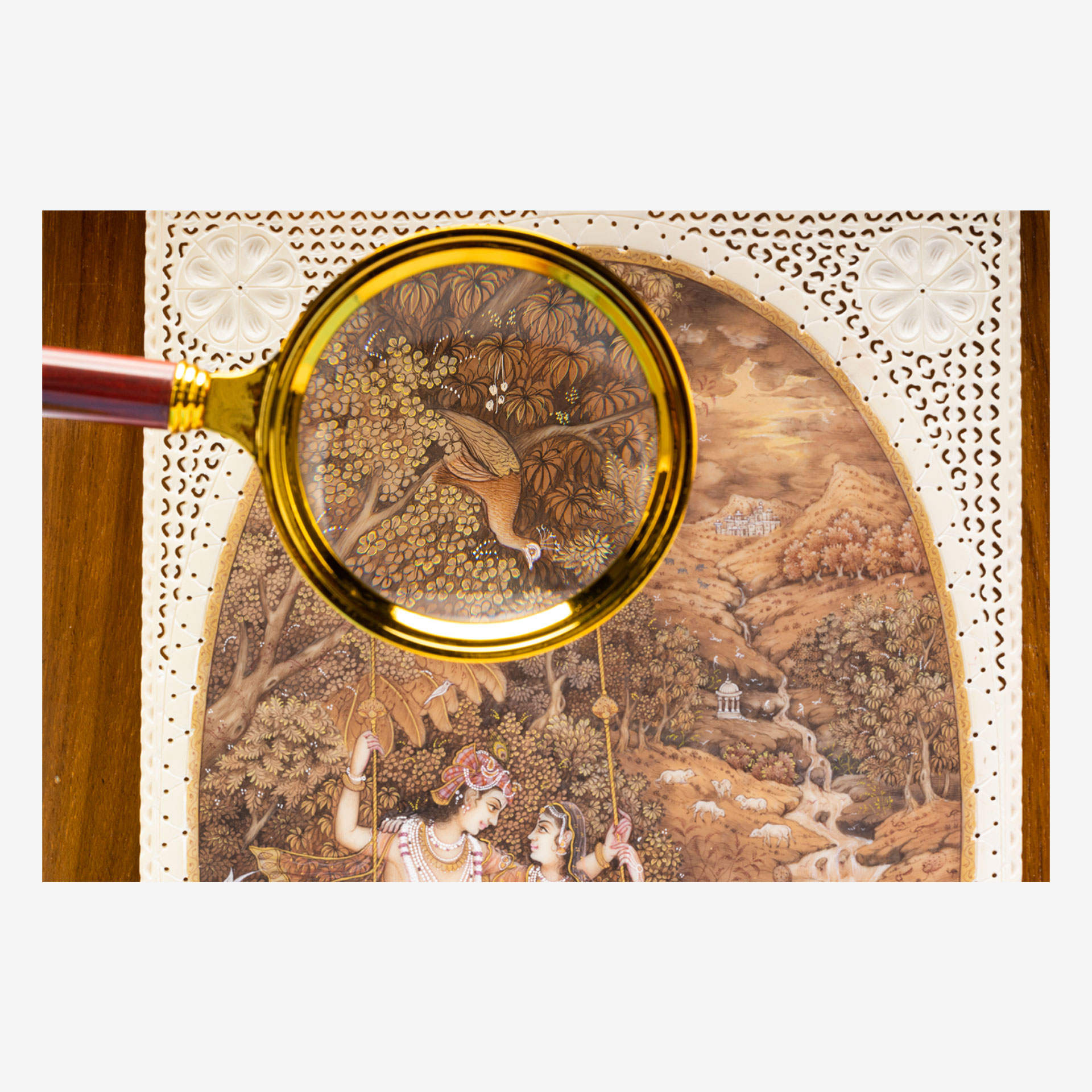These paintings are astounding even when viewed normally. However, the artisan’s creative deftness can be better appreciated by viewing it through a magnifying glass. The colours used in these hand-made paintings are derived from various natural sources like precious stones, gold, silver, indigo and flowers. The painting has been created using fine brushes to apply the organically synthesised pigments, and these brushes have fine squirrel hairs as bristles, providing the artisan the highest level of precision in his work.
